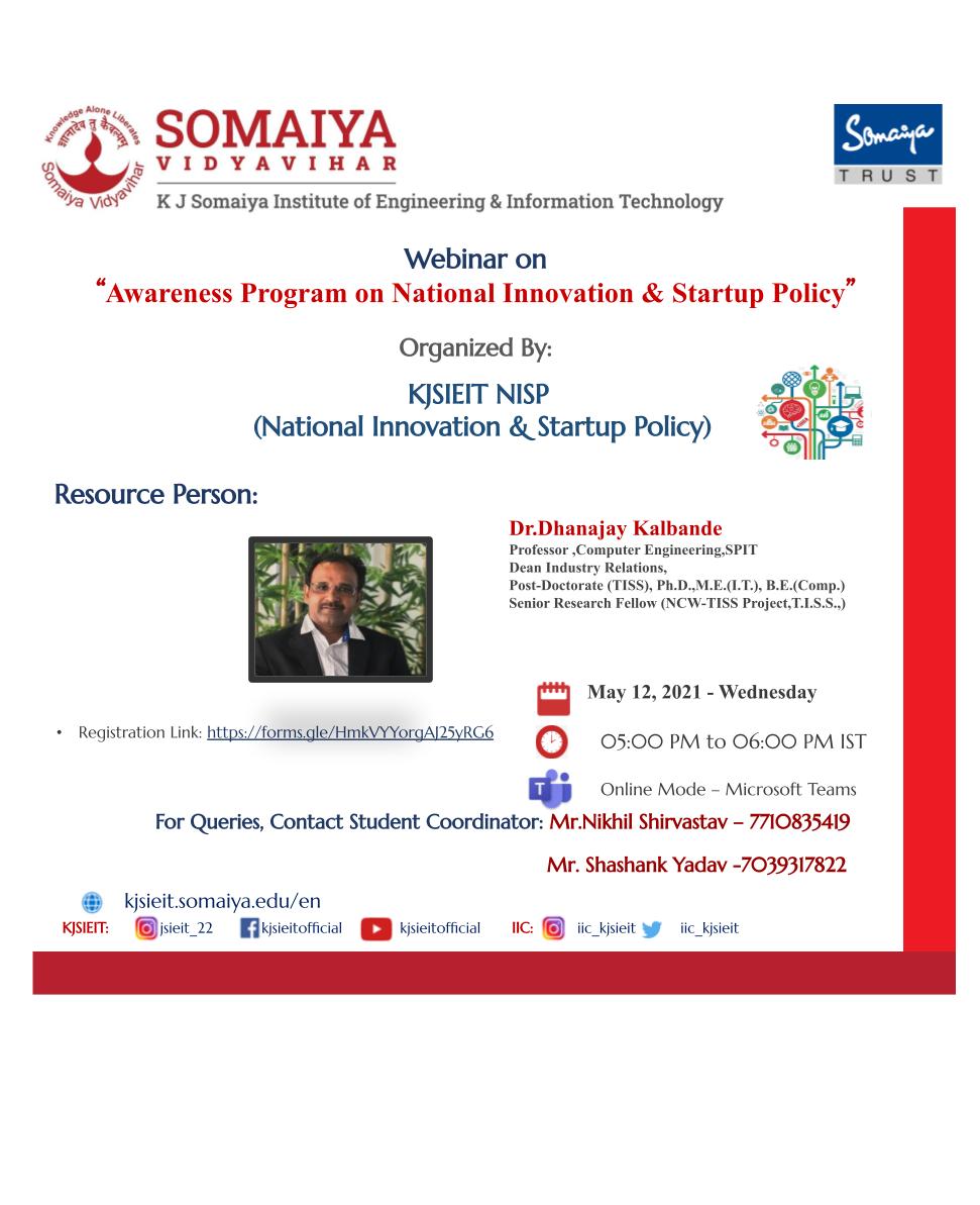 The National Innovation and Startup Policy (NISP) cell of K. J. Somaiya Institute of Engineering and Information Technology (KJSIEIT), Sion, Mumbai in association with the Institution's Innovation Council (IIC) is organizing a Seminar on ‘Awareness Program on National Innovation & Startup Policy' for Students, Staff, and Faculties on 12th May 2021 from 5.00 to 6.00 pm